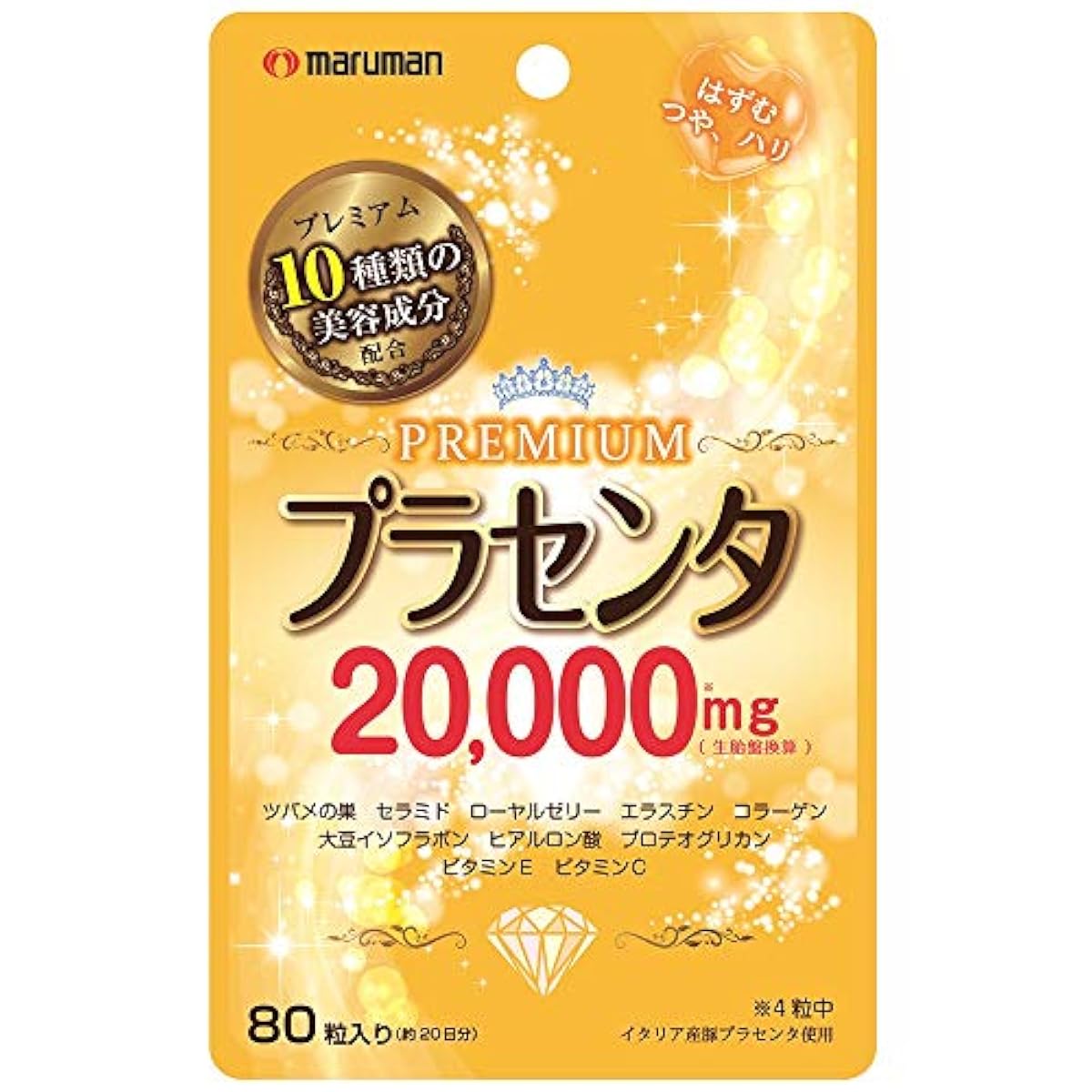 원재료:《사후라와》유,프라센타(태반) 엑기스말,히알론산,프로《데오구루칸》함유 연어비 연골 추출물,로얄 젤리말,콜라겐 펩티드,피쉬 엘라스틴,대두 ISO 플라본,세라미드,제비의 둥지(집) 엑기스,젤라틴,글리세린,글리세린 지방산 에스테르,《미츠로우》,카라멜 색소,비타민C고, 비타민E