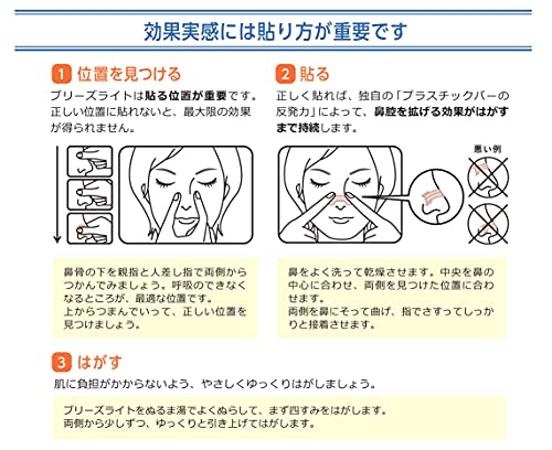 【사용 방법】 1:코를 잘 씻어 건조시킵니다. 2:중앙을 코의 중심 에 맞게 하고, 브리즈 라이트의 양측을 미츠 자리수 위치 에 맞게 합니다. 3:양측을 코에 깎아 굽히고, 손가락으로 어루만져 제대로 접착시킵니다.