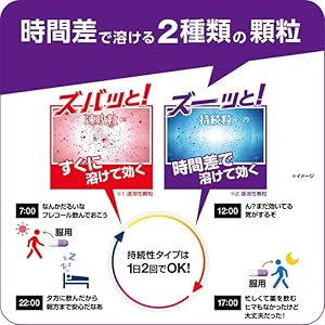 조합에 의해 아침에 먹으면 밤까지, 저녁에 먹으면 아침까지 1일 2회 복용으로 효과가 지속됩니다.