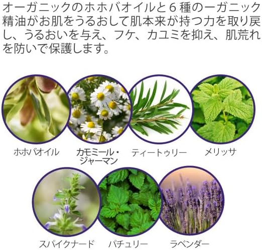 | 유효성분 | 콜드 프레스(저온 압착법)로 추출한 유기농 호호바 오일에 카모마일 저먼, 티트리, 멜리사, 스파이크나드, 파츄리, 라벤더의 6종의 유기 정유 |