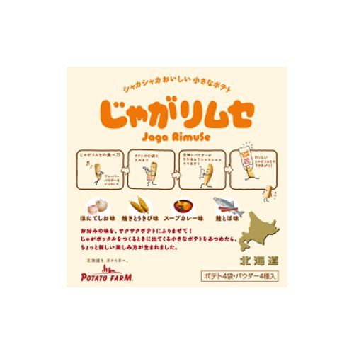 아이누어에「춤춘다」를 의미 한다「림《세》」.포테이토가 춤추는 바와 같이(하도록) 파우더를 # 이라고 맛을 냅시다.「# 세로 하여」「구이 찾는 기미」「스프 카레」「연어 날다」홋카이도 만이 가능한4개의 맛을 즐겨주십시오.《사쿠사쿠포테토》는「쟈가포클(감자스낵)」의 제조 공정으로 나와 왔 작은 사이즈입니다.