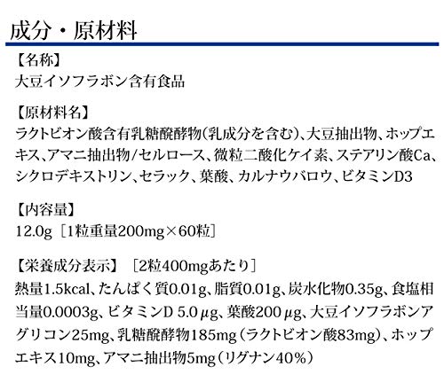 【명칭】대두 ISO 플라본 함유 식품 【원재료명】락토《비온》산 함유 유당 발효물(유성분을 포함한다)고, 대두 추출물,호프 엑기스,아마츄어《니》추출물/셀룰로오스,미립2산화 규소,스테아린산Ca고, 시쿠 러 덱스트린,《세랏쿠》,엽산,카루 now《바로우》,비타민D3 【내용량】12.0g[1 입중량200mg×60알] 【영양 성분 표시】[2 입400mg근처]열량1.5kcal고, 단백질0.01g고, 지질0.01g고, 탄수화물0.35g고, 식염 상당량0.0003g고, 비타민D 5.0μg고, 엽산200μg고, 대두 ISO 플라본 어그리 콘25mg고, 유당 발효물185mg(락토《비온》산83mg)고, 호프 엑기스10mg고, 아마츄어《니》추출물5mg(도구 난40%)