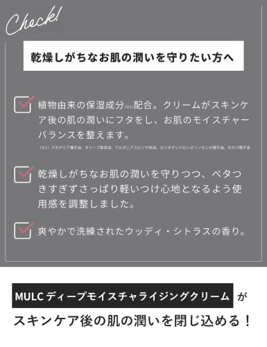 - 【스킨 케어후의 피부의 윤택으로 뚜껑을 하고, 피부의 모이스쳐 밸런스를 조절한다】크림이 스킨 케어후의 피부의 윤택으로 뚜껑을 하고, 피부의 모이스쳐 밸런스를 조절,해리가 있는 인상의 피부에 이끕니다.프리젠테이션,상담,면접,데이트,사진 촬영 등,깨끗한 기질인상을 연내밀기 싶을 때에 추천의 보습 크림. MULC시리즈의 화장수나 페이스 팩에 피부에 윤택을 준 후에 사용 하십시오.