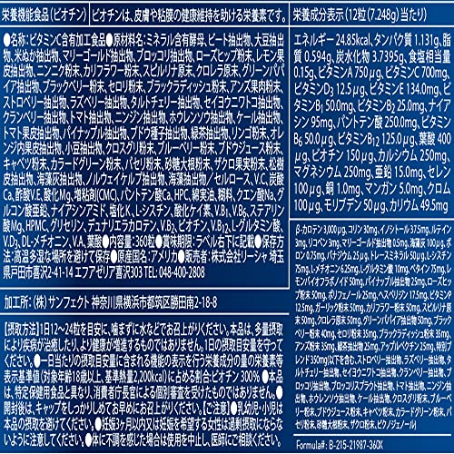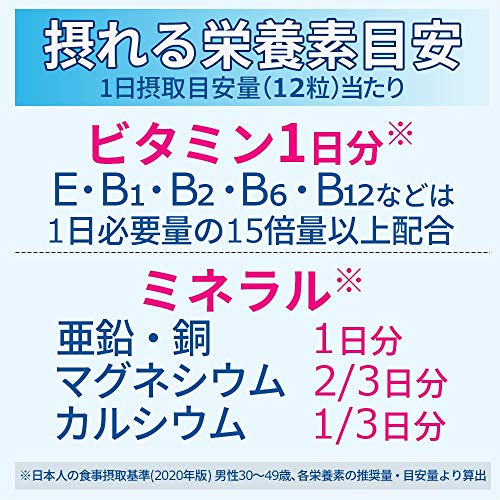• 【손에 꼽히는 함유 영양소】비타민(C고,D3,E고,B1,B2,판토텐산,B6,B12,엽산)1일분 이상/12알,미네랄(아연・동1,마그네슘2/3,칼슘1/3)일(날)분/12알을 배합.※일본인의 식사 섭취 기준(2020년 판)남성30〜49세,각 영양소의 권장량・기준료 보다 산출.또한저온 제조에 의해열로 약한 영양소(비타민B고, 비타민C)도 활성을 한없이 유지한 채로 제조되어 있습니다.